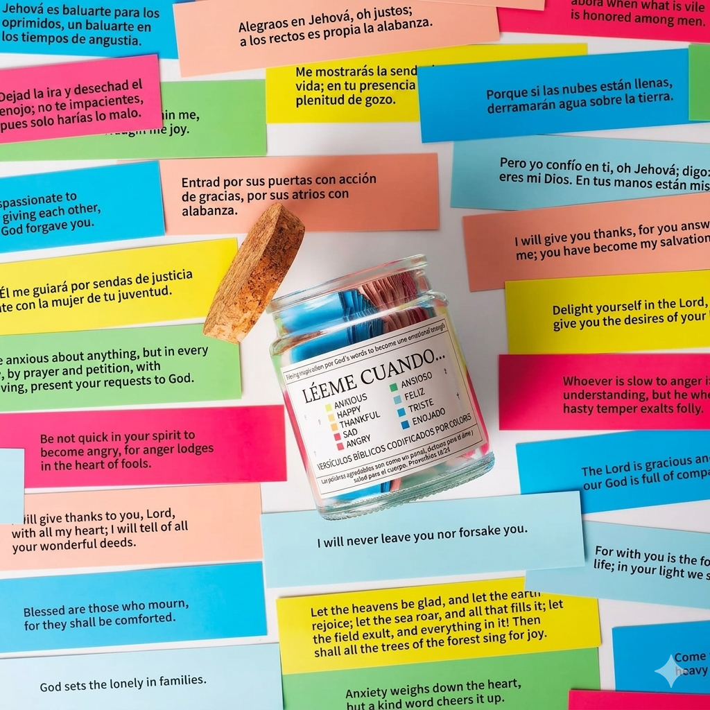 Empieza tus mañanas con propósito o encuentra refugio en los días grises con este tarro de versículos hechos a mano. Con tarjetas de colores para cada emoción, tendrás siempre a mano la palabra de Dios para acompañarte, recordándote que nunca estás sola, tanto en las alegrías como en los momentos de agobio. Es el detalle perfecto para transformar tu día a través de la fe.